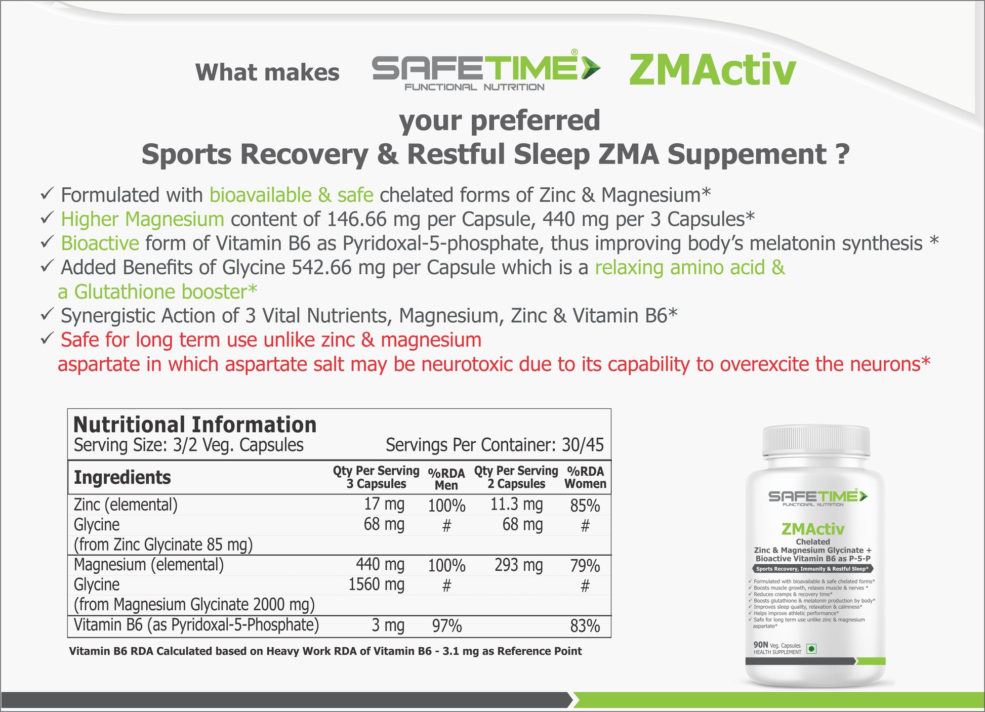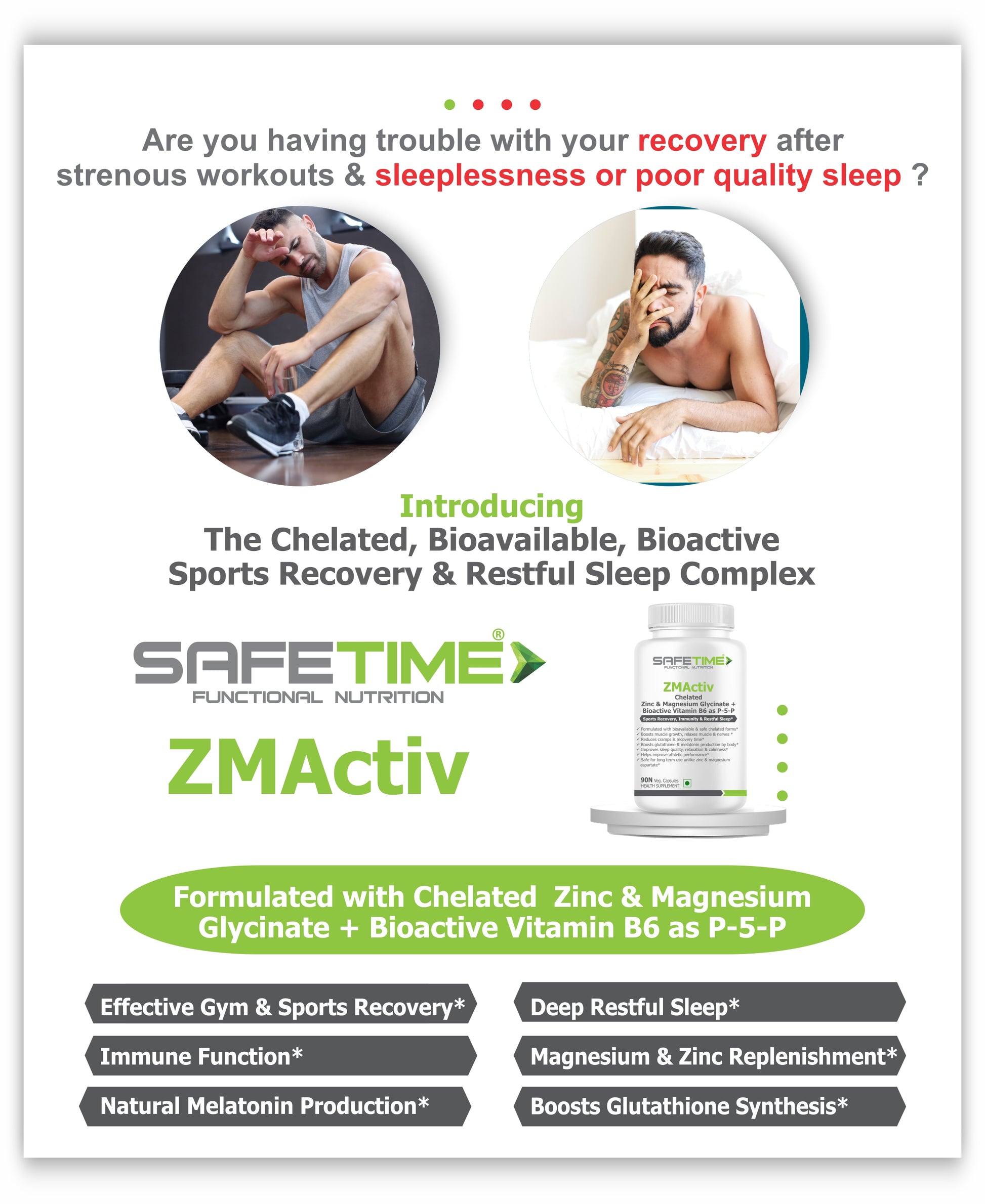 SAFETIME FUNCTIONAL NUTRITION ZMACTIV is a Next Generation ZMA Formula that act as an anabolic or muscle building supplement along with restful sleep and recovery from strenous workouts or sports events. which utilizes safe salts of Zinc & Magnesium as Glycinate unlike the potential unsafe salts of Aspartate which may cause neurotoxicity.ZMACTIV is ideal for athletes, weightlifters, and fitness enthusiasts alike as well as general wellbeing for recovery and restful sleep.