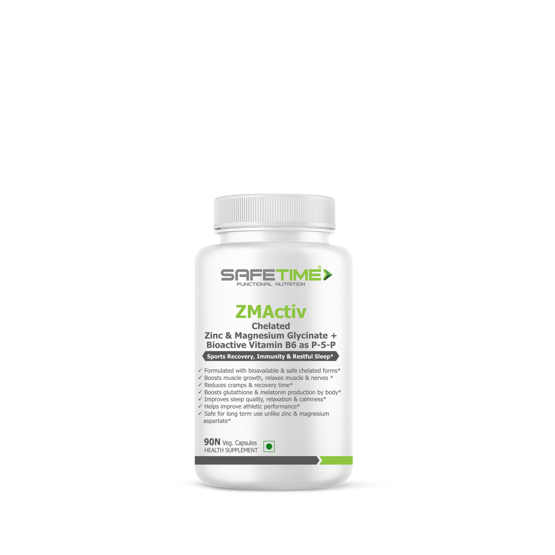 SAFETIME ZMActiv Safe, Chelated, Bioavailable Zinc & Magnesium Glycinate with Bioactive Vitamin B6 as P5P Sports Recovery, Immunity & Restful sleep (90 Veg capsules)